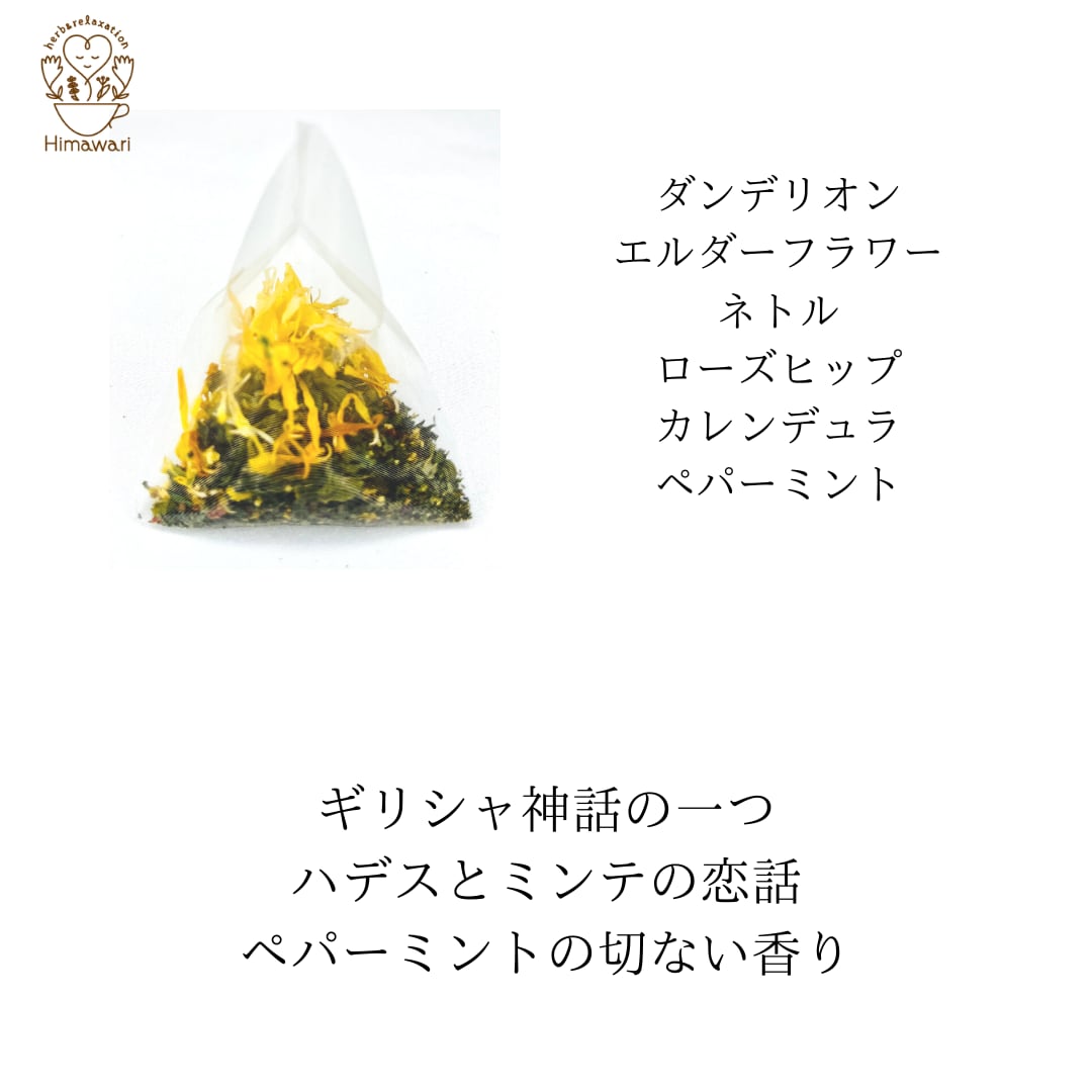 原材料名:ダンディライオン・エルダーフラワー・ネトル・ローズヒップ・カレンデュラ・ペパーミント